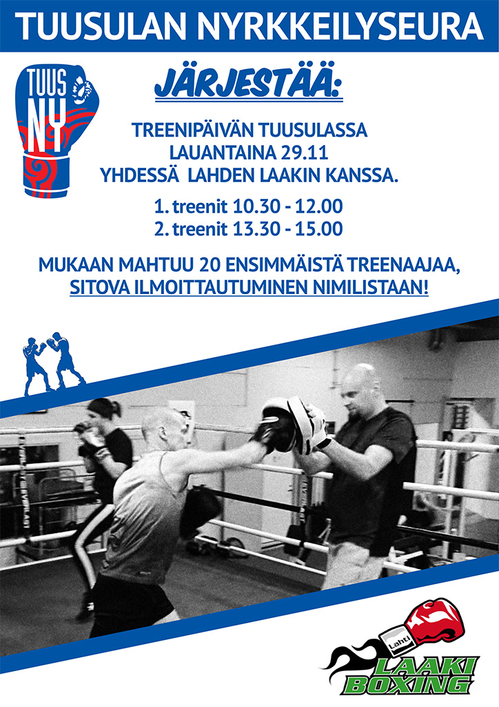 Tuusulan nyrkkeilyseura järjestää yhteistyössä Lahden Laakin kanssa kuntonyrkkeilyleirin lauantaina 29.11.2025 Tuusulassa. Leiripäivä koostuu kahdesta treenistä. Mukaan voi ilmoittautua toiseen tai molempiin treeneihin. Leiripäivä on TuuNy-jäsenille ilmainen. Mukaan mahtuu 20 ensimmäiseksi ilmoittautunutta. Ilmoittautuminen tapahtuu salin ilmoitustaululla olevaan listaan. Ilmoittautuminen on sitova. Lisätietoja Eevalta. Aikataulu