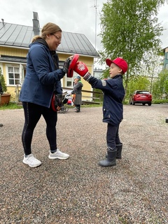 Vetäjinä nuorten nyrkkeilykoulussa ovat Kirsi Korpaeus, Vesa Korpaeus ja Olli.